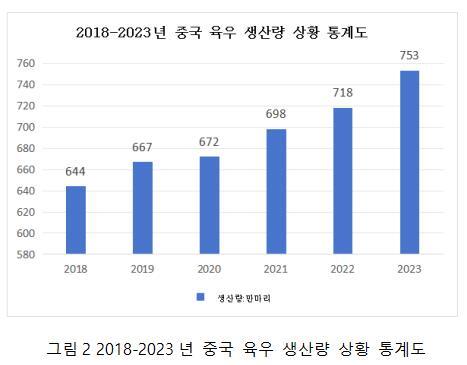 육우 사육 기술의 향상과 생산 관리의 개선에 따라 중국의 소고기 생산량도 지속적으로 증가하고 있다. 중국상업산업연구원이 발표한 “2025~2030년 중국 육우 양식 업계 전망 예측과 전략적 투자 기회 통찰 연구 브리핑”에 따르면, 2023년 중국의 소고기 생산량은 753만 톤으로, 전년 대비 4.8% 증가한 것으로 나타났다