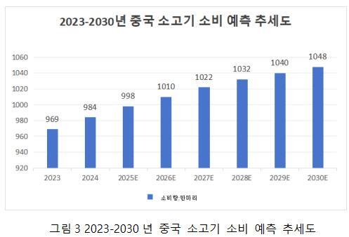 소비 전망으로 볼 때 내수 시장의 성장과 소비 구조의 고급화가 지속되면서, 소고기와 양고기는 고품질 단백질 공급원으로서 점점 더 중요한 위치를 차지하게 될 것이다. 이에 따라 소고기의 육류 소비 비중이 지속적으로 증가할 것으로 보인다. 예측에 따르면, 2030년까지 중국의 소고기 소비량은 1,048만 톤에 이를 것으로 전망되며, 연평균 복합 성장률(CAGR)은 1.13%로 유지될 것으로 예상된다.