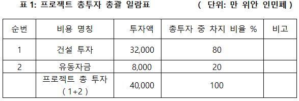 프로젝트 총투자는 4억 위안이고, 그중 건설 투자가 3억 2천만 위안, 운영 자금이8천만 위안이다.