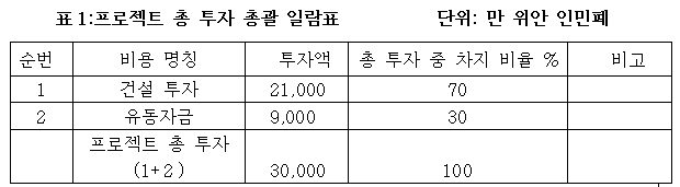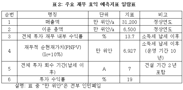 프로젝트 가동 후, 연 평균 매출액 만 31,200위안, 이윤 6,500만 위안, 투자회수기 7년 (납세 이후, 건설기간 2년 포함), 투자 수익률 19%.