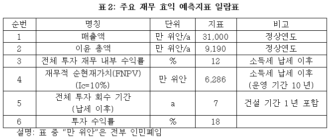 프로젝트 가동 후, 연 평균 매출액 31,000만 위안, 이윤 9,190만 위안, 투자회수기 7년 (납세 이후, 건설기간 1년 포함), 투자 수익률 18%.