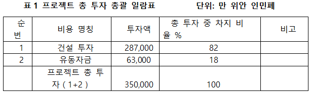 프로젝트의 총 투자는 350,000만 위안이며, 그 중 건설 투자가 287,000만 위안이고 유동 투자가 63,000만 위안이다.