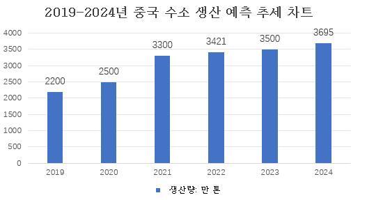 중국은 정책과 시장의 주도로 세계 최대 수소 생산국이 되었다. 2023년 전국 수소 생산능력은 약 4,900만 톤/년이 생산량은 약 3,500만 톤으로 두 수치 모두 전년 대비 약 2.3% 증가. 2024년 중국의 수소 생산량이 3,695만 톤에 달한다.