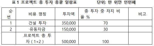 프로젝트의 총 투자는 500,000만 위안이며, 그 중 건설 투자가 350,000만 위안이고 유동 투자가 150,000만 위안이다.