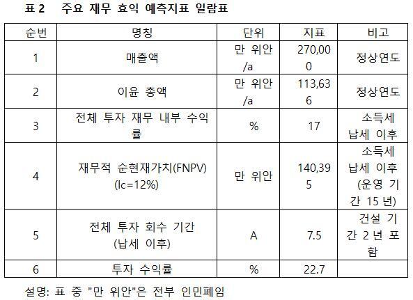 프로젝트가 설계 생산 능력의 생산량에 도달한 후 연 평균 매출액 270,000만 위안, 이윤 113,636만 위안, 투자회수기 7.5년 (납세 이후, 건설기간 2년 포함), 투자 수익률 22.7%.