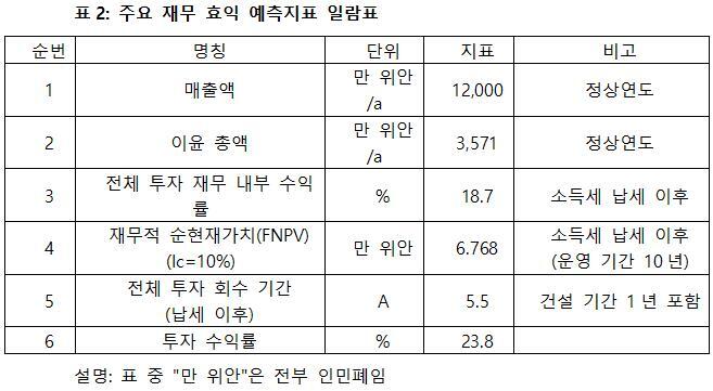 프로젝트가 설계 생산 능력의 생산량에 도달한 후 연 평균 매출액 12,000만 위안, 이윤 3,571만 위안, 투자회수기 5.5년 (납세 이후, 건설기간 1년 포함), 투자 수익률 23.8%.