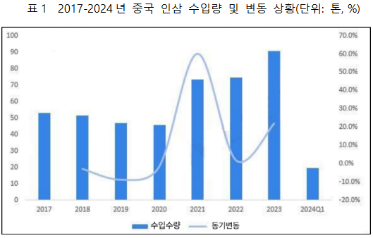 2020년부터 2023년까지 코로나19의 영향으로 중국의 인삼 수입량이 계속 증가할 것이이다. 2023년 수입량은 약 90톤에 달했으며, 전년 대비 21.8% 증가했다. 2022-2023년 수입 금액은 안정세를 유지하여 2023년까지 약 3,229만 달러에 달했다. 수입 제품의 출처를 보면, 2023년 중국 인삼 수입의 주요 출처는 캐나다, 한국, 미국, 그 중 캐나다가 약 60%, 한국이 약 26%, 미국이 15%를 차지한다. 중국은 인삼 생산량이 많은 나라로 인삼 수입의 전반적인 관점에서 볼 때 중국은 주로 대외적으로 수입가치가 높은 정밀가공품으로 양은 적지만 부가가치가 높으며 국내 소비자 소득이 증가함에 따라 인삼 제품의 품질에 대한 요구 사항이 증가하여 산업의 수입을 촉진할 것이다. 종합적으로 볼 때 우리나라 인삼 산업의 수입 상황은 비교적 양호하며 주요 경쟁 압력은 국내 인삼 브랜드의 부상과 인삼 기술의 향상에서 비롯된다.