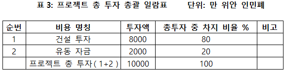 이 프로젝트의 총 투자액은 10,000만 위안이며 그 중 건설 투자액은 8000만 위안, 운전 자본은 2000만 위안이다.