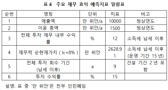 프로젝트가 설계 생산 능력의 생산량에 도달한 후, 연평균 매출액 10,000만 위안, 이윤 1,500만 위안, 투자회수기 9년(납세 이후, 건설 기간 2년 포함), 투자 수익률은 15%이다.