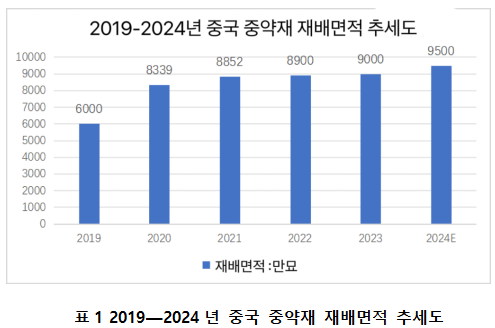 (2) 중약재 산업 시장 현황 분석 및 발전 추세 중약재 재배는 중국에서 오랜 역사와 깊은 문화적 배경을 가지고 있으며 현대 의학 및 건강 산업의 급속한 발전과 함께 중약재에 대한 시장 수요는 지속적으로 증가하고 있다. 최근 몇 년 동안 중국의 중약재 재배 면적은 빠르게 성장했으며 중약재 재배는 일부 지역, 특히 가난한 산간 지역에서 재배 산업 구조를 조정하고 농민의 소득을 높이고 부자가 되는 중요한 산업이 되었다. 통계에 따르면 중국의 중약재 재배면적은 2019년부터 2023년까지 증가하고 있으며 2021년 중국의 중약재 재배면적은 8,852만 무에 달했으며, 2022년에는 정책의 영향으로 여러 지역에서 산림환경, 재경작 등의 조치를 적극적으로 시행하여 중약재 재배면적이 크게 감소하였고 기후 요인의 영향으로 재배비용이 상승하여 약재농가의 수익이 높지 않아 재배면적이 크게 감소하였다. 2022년 중국의 중약재 재배 면적은 8,900만 묘에 달했다. 2023년 중국의 중약재 총 재배 면적은 9천만 묘에 달하며, 주로 윈난, 쓰촨, 구이저우, 허난 등 성에 분포되어 있습니다. 2024년 중국의 중약재 재배 면적은 9,500만 묘에 이를 것이이다.