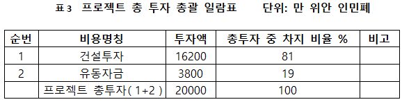 이 프로젝트의 총 투자액은 20,000만 위안이며 그 중 건설 투자액은 16,200만 위안, 유동 자본은 3,800만 위안이다.