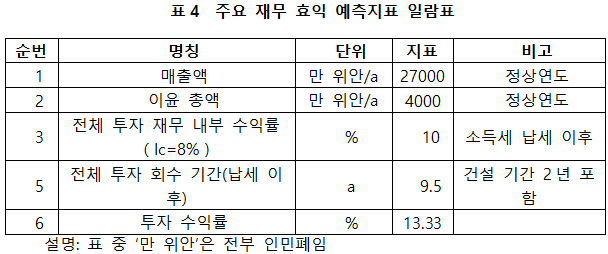 프로젝트가 설계 생산 능력의 생산량에 도달한 후, 연평균 매출액 27,000만 위안, 이윤4,000만 위안, 투자회수기9.5년(납세 이후, 건설 기간 2년 포함), 투자 수익률은13.33%이다.