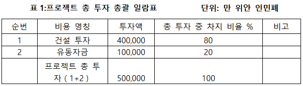 프로젝트 총 투자는 500,000만 위안이며 그 중 건설 투자가 400,000만 위안이다.