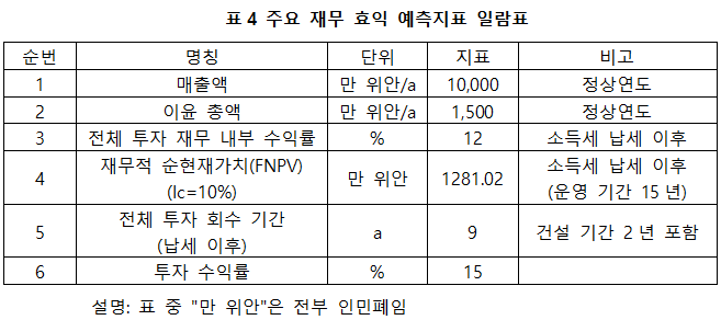 프로젝트 가동 후 연 평균 매출액 10,000만 위안, 이윤 1,500 만 위안, 투자회수기 9년(납세 이후, 건설기간 2년 포함), 투자 수익률 15%.