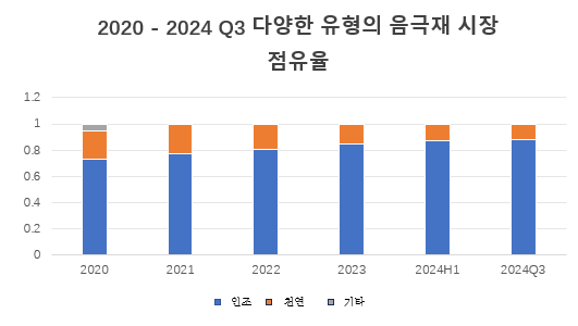 소재 종류별로 보면 국산 인조흑연 음극이 여전히 주류를 이루고 있으며 인조 음극의 비중이 꾸준히 증가해 2024년 3분기에는 약 88%에 달해 역대 최고치를 기록할.