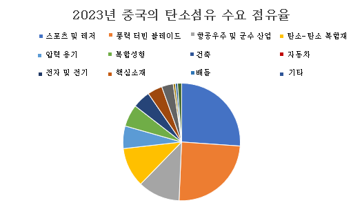 탄소섬유는 뛰어난 특성을 지닌 새로운 소재로서 여러 분야에서 중요한 역할을 담당하고 있다. 시장점유율 측면에서 2023년 중국 탄소섬유 수요 상위 3대 분야는 스포츠 및 레저, 풍력 터빈 블레이드, 항공우주 및 군수 산업으로 각각 26.1%, 24.6%, 11.6%를 차지할 것이다.