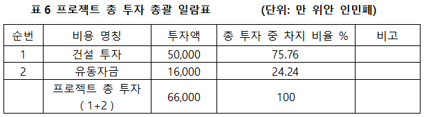 프로젝트의 총 투자는 66,000만 위안이고 이 중 건설 투자가 50,000만 위안이며 운전자금이 16,000만 위안이다.