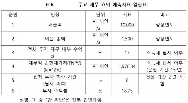 프로젝트가 설계 생산 능력의 생산량에 도달한 후, 연 평균 매출액 10,000만 위안, 이윤 1,500만 위안, 투자회수기 8년 (납세 이후, 건설기간 2년 포함), 투자 수익률 18.75%.