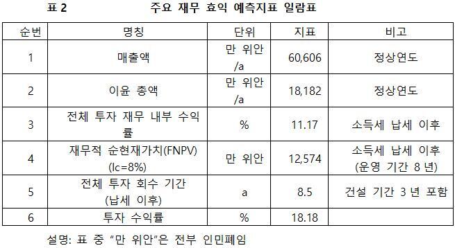 프로젝트가 설계 생산 능력의 생산량에 도달한 후 연간 매출액 60,606만 위안, 이윤 18,182만 위안, 투자 회수 기간 8.5년(납세 이후, 건설 기간 3년 포함), 투자 수익률은 18.18%이다.