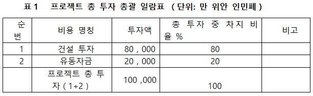 프로젝트의 총 투자는 100,000만 위안이며, 그 중 건설 투자가 80,000만 위안이다.