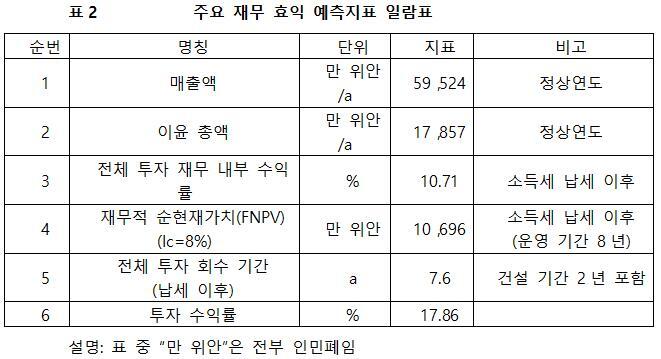 프로젝트가 설계 생산 능력의 생산량에 도달한 후, 연 평균 매출액 59,524만 위안, 이윤 17,857만 위안, 투자회수기 7.6년 (납세 이후, 건설기간 2년 포함), 투자 수익률 17.86%.