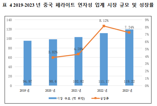 2023년 중국의 페라이트 연자성 소재 판매량은 약 51만 톤으로, 전년 동기 대비 5.8% 증가했다. 2019년 중국 페라이트 연자성 소재 산업 시장 규모는 94.97억 위안, 2023년 중국 페라이트 연자성 소재 산업 시장 규모는 119.22억 위안이다. 연간 복합 성장률은 약 5.87%이다.