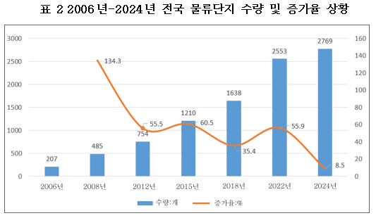 중국물류구매연합회가 8월 22일 발표한 《제7차 전국 물류단지 조사보고서》에 따르면 전국 물류단지 수는 2769개로, 6차 조사 2553개에 비해 8.5% 증가하며 전반적으로 안정적인 성장세를 유지하고 있다. 또한, 운영 및 건설 중인 물류 단지의 비중이 더욱 증가했다.