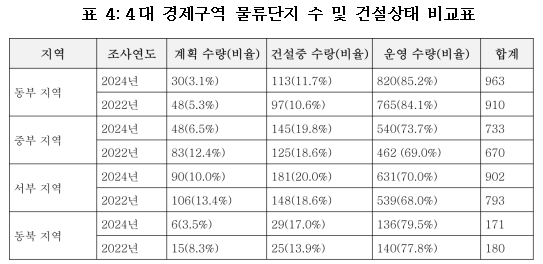 4대 경제구역에서 운영 중인 물류단지(이하 '운영단지'라 함)의 비중이 모두 서로 다른 정도로 증가했다. 그중 중부 지역의 운영 단지 비율은 73.7%로 가장 많이 증가하여 2022년 조사의 69.0%보다 4.7% 증가했다. 동부 지역의 운영 단지 비율은 85.2%로 네 개의 경제 지역 중 가장 높으며, 서부 지역과 동북 지역의 운영 단지 비율은 각각 70.0%와 79.5%로 2022년 조사에 비해 약 2% 증가했다.