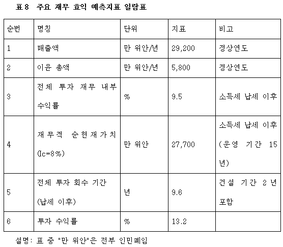 프로젝트 완료 후 연간 매출은29,200만 위안, 이윤5,800만 위안, 투자회수기 9.6년(납세 이후, 건설 기간 2년 포함), 투자 수익률 13.2%이다.