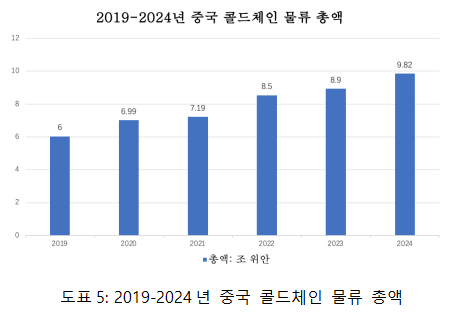 시장 수요의 지속적인 증가, 정부 정책의 지원, 콜드체인 인프라의 지속적인 개선, 기술 진보 및 혁신 주도로 중국의 콜드체인 물류 총액은 끊임없이 증가되고 있다. 중상산업연구원이 발표한 《2024-2029년 중국 콜드체인 물류 산업 연구 및 발전 전망 분석 보고서》에 따르면, 2023년 중국 콜드체인 물류 총액은 8조 9천억 위안에 달했으며 2022년에 비해 400억 위안 증가하여 전년 대비 4.6% 늘어났다. 2024년 중국의 콜드체인 물류 총액이 9조 8,200억 위안으로 증가했다.