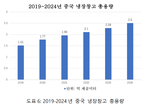 냉장창고는 콜드체인 물류의 “거점”이라 할 수 있으며 냉장창고의 건설과 발전은 국가 중추 콜드체인 물류 기지의 최우선 과제로 되었다. 중상산업연구원이 발표한 《2024-2029년 중국 콜드체인 물류 산업 연구 및 발전 전망 분석 보고서》에 따르면, 2023년 전국 냉장 창고 총량은 약 2억 2,800만 입방미터로, 전년 대비 1,800만 입방미터 증가하여 전년 대비 8.3% 늘어났다. 2024년 중국의 냉동 창고 총 용량이 2억 5천만 입방미터에 이르렀다.