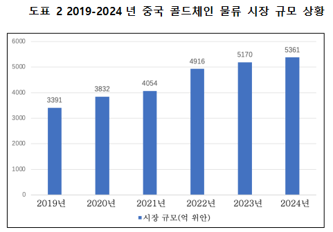 최근 몇 년 동안 사람들의 생활 수요가 증가하고 수입 콜드체인 제품, 신선 식품 전자상거래, 커뮤니티 공동 구매, 라이브 커머스, 즉석 조리 식품 등 새로운 형태의 발전이 중국 콜드체인 물류 시장 규모의 지속적인 성장을 추진했다. 2023년 중국 콜드체인 물류 시장 규모는 5,170억 위안에 달하여 전년 대비 5.2% 증가했다. 2024년 중국 콜드체인 물류 시장 규모는 5,361억 위안으로 전년 동기 대비 3.7% 증가했다.