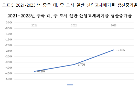 근년래 중국은 한편으로 에너지 구조와 산업 구조 조정을 가속화하고 전통적인 석탄, 철강, 건축 자재, 비철금속, 석유화학 및 기타 원자재 산업의 생산 규모를 해마다 줄이고 다른 한편으로는 환경 보호에 점점 더 많은 관심을 기울이면서 기업의 자체 생산 기술이 지속적으로 최적화되고 생산 효율이 향상되었으며 자체 고형 폐기물 발생량도 어느 정도 감소했다. 2023년, 중국의 일반 산업 고체 폐기물 발생량은 11억 7천만 톤으로 감소하여 전년 대비 2.4% 감소했다.