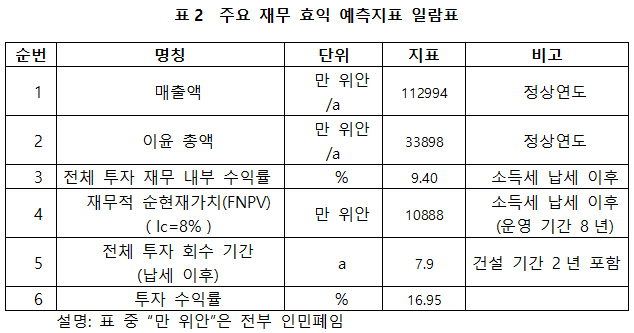 프로젝트가 설계 생산 능력의 생산량에 도달한 후 연간 매출액 112994만 위안, 이윤 33898만 위안, 투자 회수 기간 7.9년(납세 이후, 건설 기간 2년 포함), 투자 수익률은 16.95%이다.