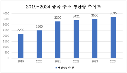 정책과 시장의 이중 추진 덕분에 중국은 세계에서 가장 큰 수소 생산국으로 되었다. 2023년 말 기준, 전국 수소 생산 능력은 연간 약 4,900만 톤이며, 생산량은 약 3,500만 톤으로 전년 대비 약 2.3% 증가했다. 2024년 중국의 수소 생산량은 3,695만 톤에 달하였다.