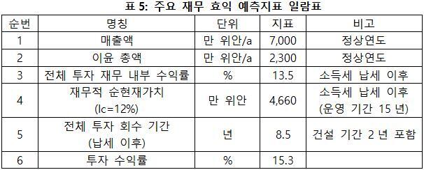 프로젝트가 설계 생산 능력의 생산량에 도달한 후 연간 매출액 7,000만 위안, 이윤 2,300만 위안, 투자 회수 기간 8.5년(납세 이후, 건설 기간 2년 포함), 투자 수익률은 15.3%이다.
