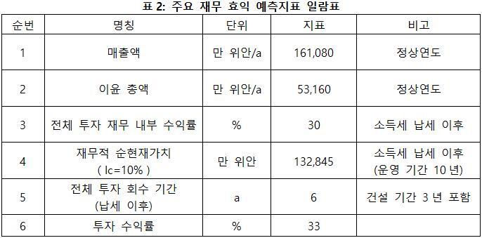 프로젝트가 설계 생산 능력의 생산량에 도달한 후 연간 매출액 161,080만 위안, 이윤 53,160만 위안, 투자 회수 기간 6년(납세 이후, 건설 기간 3년 포함), 투자 수익률은 33%이다.