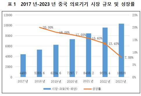 중국 의료기기의 시장 규모는 2017년 약 4,403억 위안에서 2023년 10,328억 위안으로 꾸준히 증가했으며, 연평균 복합 성장률은 15.34%로, 이러한 성장폭은 중국 의료기기 시장의 강력한 발전 트렌드를 보여준다. 의료 기술의 지속적인 혁신과 의료 개혁의 심화에 따라 향후 몇 년간 중국 의료기기 시장은 여전히 성장세를 유지할 것으로 예상되지만, 성장 속도는 상대적으로 안정적일 것이다.