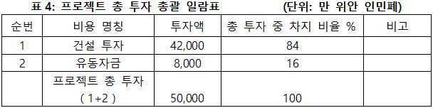 프로젝트의 총 투자는 50,000만 위안이며, 그 중 건설 투자가 42,000만 위안, 유동자금이 8,000만 위안이다.
