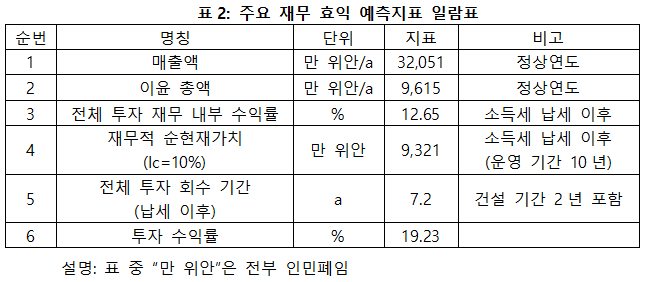프로젝트가 설계 생산 능력의 생산량에 도달한 후 연간 매출액 32,051만 위안, 이윤 9,615만 위안, 투자 회수 기간 7.2년(납세 이후, 건설 기간 2년 포함), 투자 수익률은 19.23%이다.