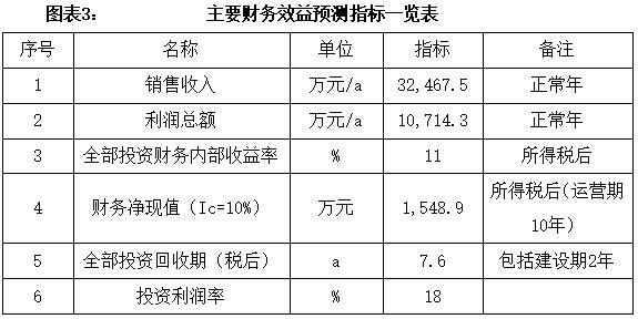 项目达产后,年销售收入32,467.5万元,利润10,714.3万元,投资回收期7.6年(税后,含建设期2年),投资利润率18%。