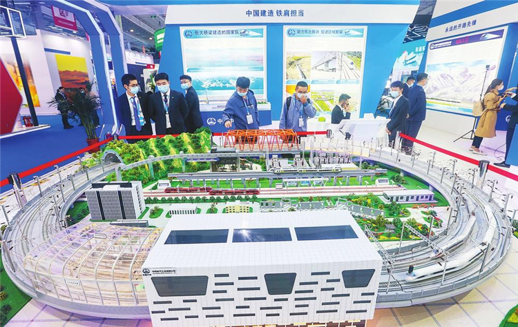 在科技创新主题展区,中外展商向观众展示最新科技成果、最时尚互动体验和最潮流技术运用。图为参观者对中国中铁铁路接触网供电系统演示沙盘产生浓厚兴趣。石雷 丁研 摄