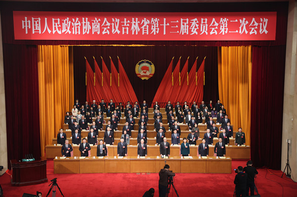 现在我宣布:中国人民政治协商会议吉林省第十三届委员会第二次会议,开幕!全体起立,唱国歌。