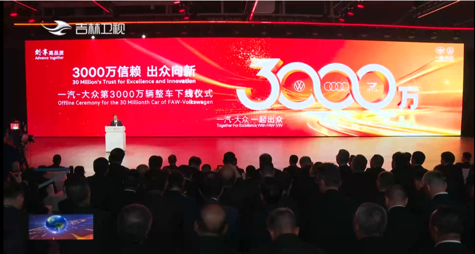 10月30日,一汽-大众第3000万辆整车下线仪式在长春举行。省委副书记、省长胡玉亭出席。