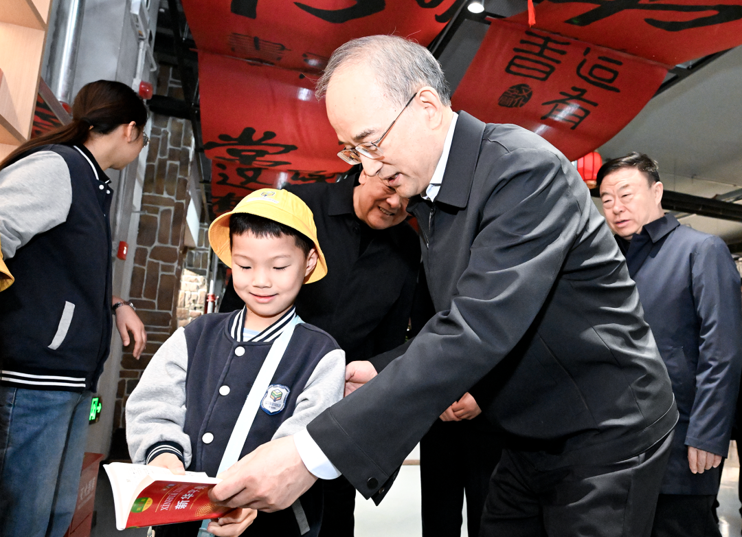 4月13日,省委书记黄强在长春调研,在“这有书”书店与正在研学的幼儿园小朋友一起查字典、找“吉”字。张野 摄