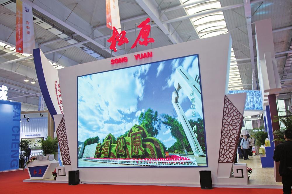 紧扣绿色发展主题,松原整个展位设计风格通透、大方,通过全开放的空间构造模式,把松原的资源优势、产业情况以及历史文化用文字及造型的方式在展台的各个方位体现出来。