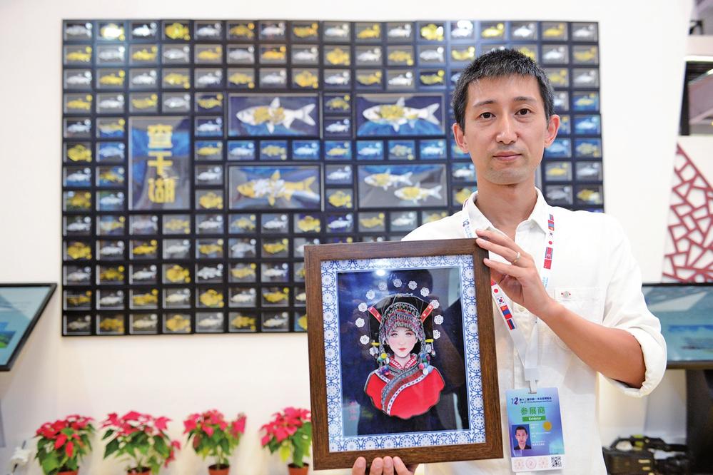 在众多本地名优新特产品中,吉林省萨满文化传播有限公司的手工艺品“查干湖万鱼图”最引人注目。该作品由200多幅小型手工制作的纸鱼图组成,采用“多层纸雕工艺”,每条鱼层次分明,活灵活现。