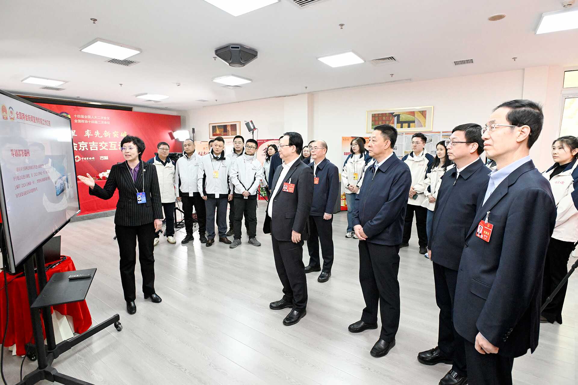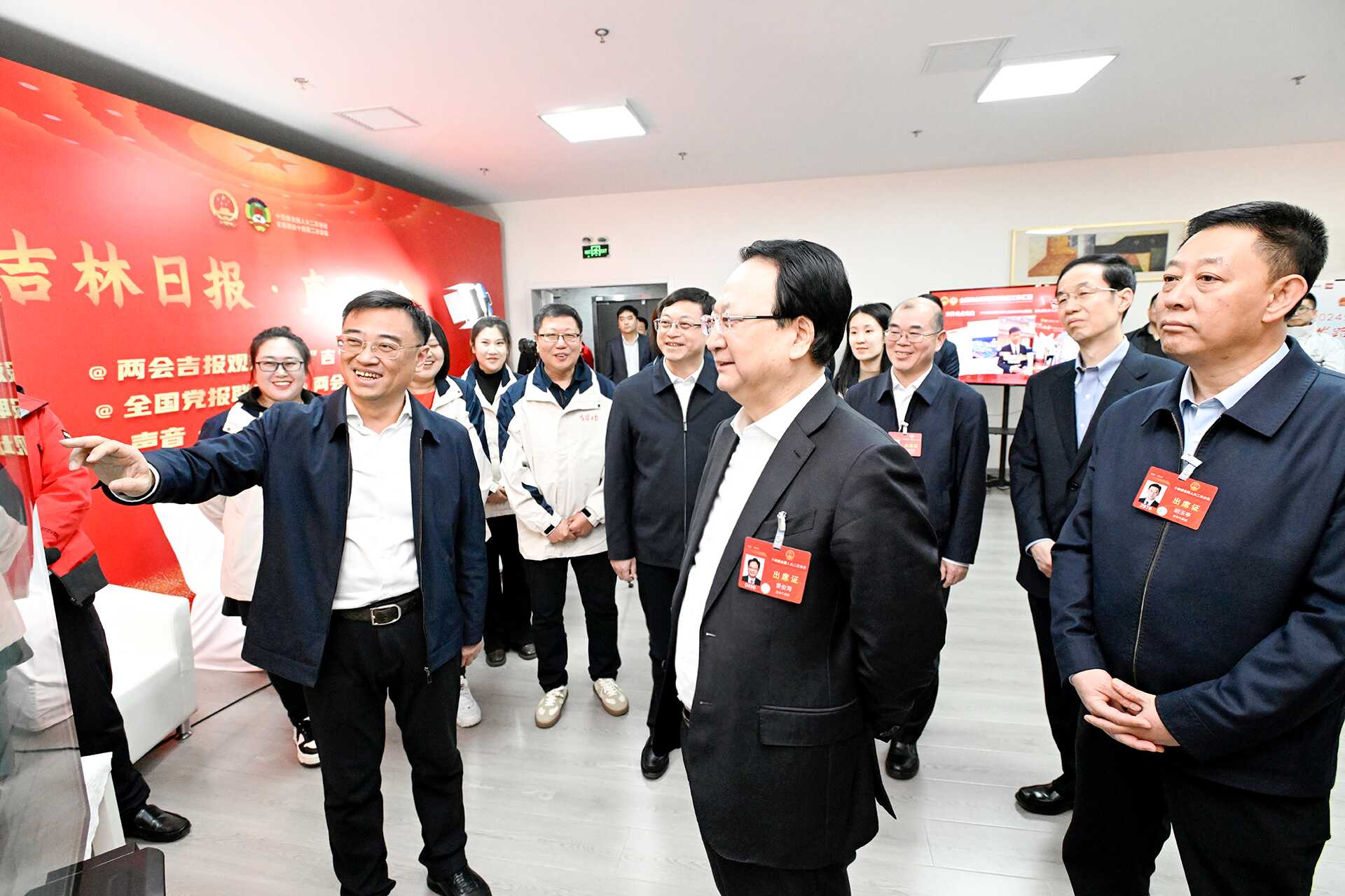 3月9日,省委书记、省人大常委会主任景俊海,省委副书记、省长胡玉亭,省政协主席朱国贤到省直新闻单位全国两会报道团队驻地,实地察看吉林日报、吉林广播电视台、中国吉林网前方工作室和演播平台,详细了解新闻报道采编刊播等制作流程。邹乃硕 摄