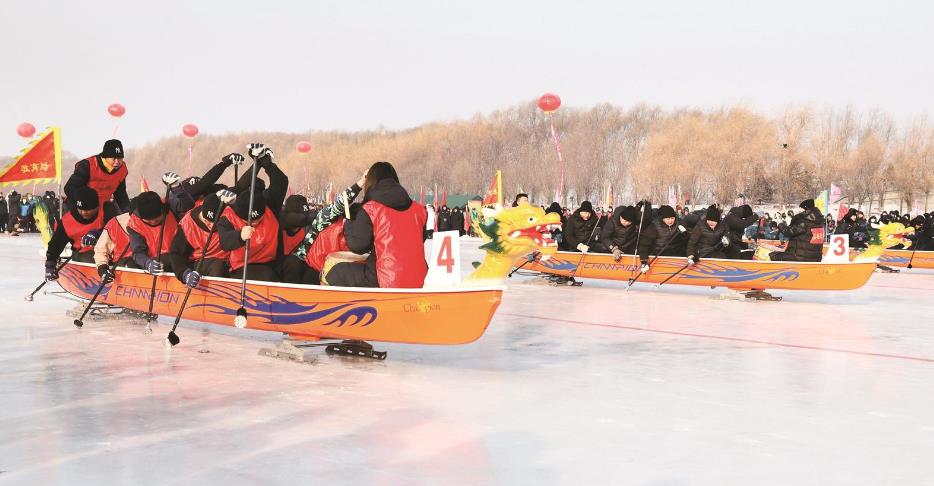 12月30日,白城·大安冰雪季系列活动在大安嫩江湾旅游区启幕。图为在冰上龙舟赛环节,运动员们奋力挥桨、全力冲刺。李姣月 刘奥琪 摄