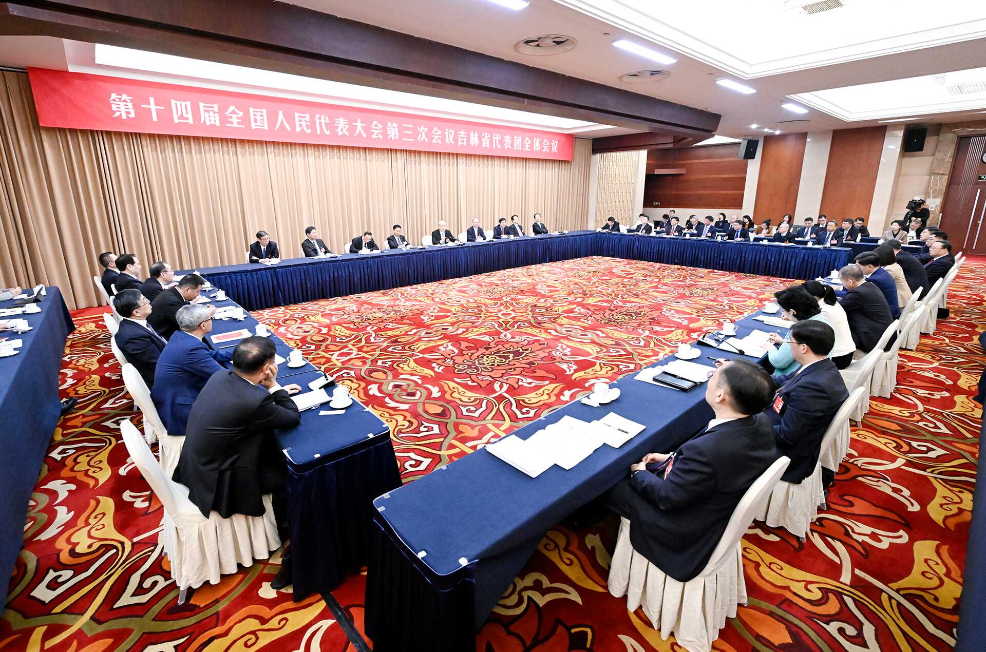 3月9日上午,参加十四届全国人大三次会议的我省代表团,审议关于修改全国人民代表大会和地方各级人民代表大会代表法的决定草案,最高人民法院工作报告、最高人民检察院工作报告。最高人民法院院长张军到会听取意见。吉林省代表团团长黄强、副团长胡玉亭参加审议并发言。巴音朝鲁、雒树刚、景俊海参加审议。